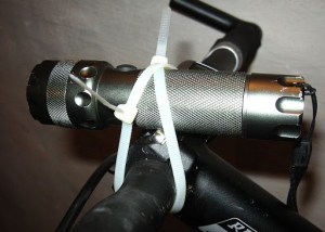 Die stärkste LED-Lampe gegriffen, die ich finden konnte, Kabelbinder her und rauf auf den Vorbau. Glücklicherweise hatte der Vorbau zwei passende Kanten, so dass die Lampe sehr gut fixiert werden konnte und nicht wackelte.