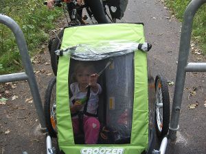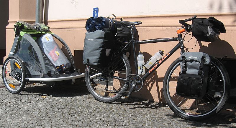 Das im vorigen Beitrag vorgestellte „neue“ Reiserad wurde gleich genutzt, oben ist das komplett bepackte Gespann zu sehen. Den Anhänger haben wir für unsere kleine Tochter ausgeliehen, das klappte ganz hervorragend. Und mit diesem Gespann gab es bei einem vermutlichen Gesamtgewicht von etwa 200 Kilogramm auf der ganzen Reise nur einen 17er Schnitt, aber uns kam es ja auch nicht auf Geschwindigkeit an.