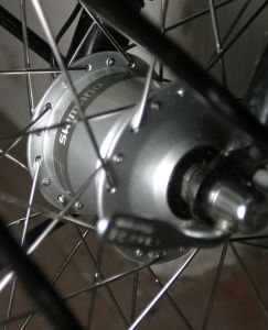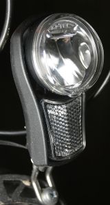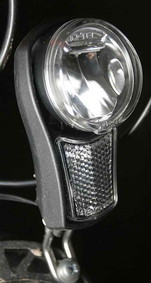 Ich bin von dieser Kombination absolut begeistert. Der Scheinwerfer namens Lumotec Fly senso plus von Busch und Müller liefert einen hellen und sehr gleichmässigen Lichtteppich ab. Der Lichtkegel trifft etwa drei Meter vor dem Rad auf den Weg auf und leuchtet bis ca. 15 Meter vor dem Rad eine Breite von zwei Metern aus. Dabei gibt es keine extrem hellen oder dunklen Stellen, einfach nur Licht! Durch das Dynamorad ist das Licht immer verfügbar, aber leider nicht so leicht zwischen den Rädern zu wechseln. Ausserdem finde ich die Sensorschaltung überflüssig, viel zu leicht rutscht der Schalter von „Aus“ über „Ein“ auf „Sensorautomatik“. Und dann wird der Scheinwerfer durch das Licht überholender Autos abgeschaltet! Einen kleinen Nachteil gibt es noch: in Kurven geht das Licht natürlich erst sehr spät dahin, wo man langfährt, aber ansonsten ist das Licht absolut tauglich für Wald- und Feldwege.
