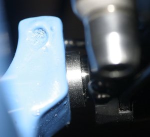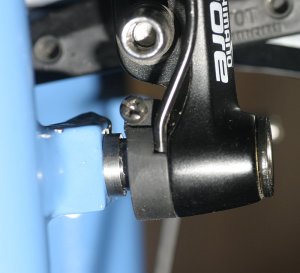 Tja, eigentlich…das obige Foto zeigt mein Problem: die Bremskörper rutschen nicht weit genug auf die Cantisockel. Die kleinen Federchen, die die Bremsen wieder von der Felge wegholen sollen und normalerweise in Bohrungen neben dem Cantisockel Verankerung finden, hängen bei mir in der Luft…