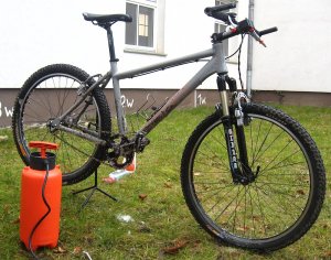 Vor dem Absprühen habe ich das Rad mit Fahrradreiniger eingesprüht, der Schaum weicht den Dreck gut vor.
