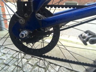 Riemenantriebe für Fahrräder gibt es seit langer Zeit, aber sie haben sich nicht flächendeckend durchsetzen können. Die Anforderungen an die Rahmen und die Montage sind hoch, die Riemen reagieren im Vergleich zur Kette recht sensibel auf eine fehlende Parallelität von Kurbel&Nabe oder einen Versatz in der „Kettenlinie“. In Dresden habe ich ein Rad entdeckt, das durch ein „loses“ Ritzelrad hinten die möglichen Ungenauigkeiten von einfacheren Rahmen ausgleichen will.