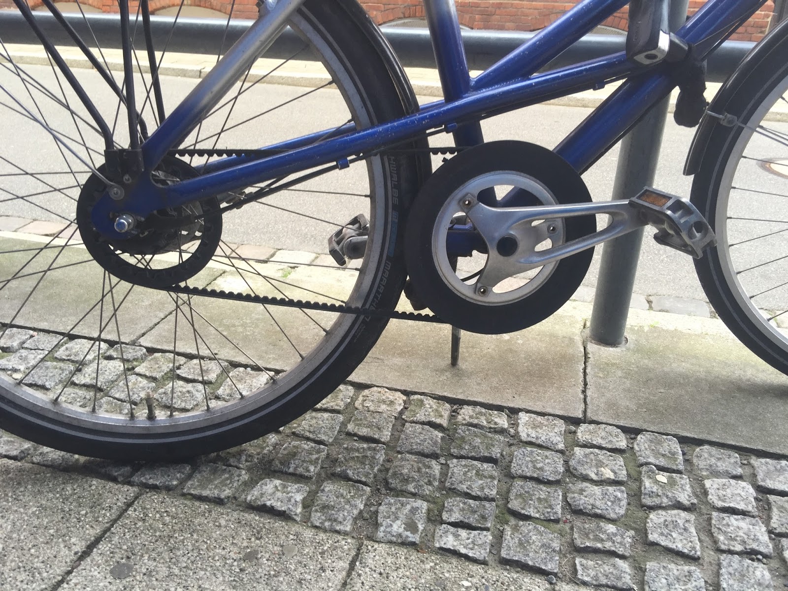 Riemenantriebe für Fahrräder gibt es seit langer Zeit, aber sie haben sich nicht flächendeckend durchsetzen können. Die Anforderungen an die Rahmen und die Montage sind hoch, die Riemen reagieren im Vergleich zur Kette recht sensibel auf eine fehlende Parallelität von Kurbel&Nabe oder einen Versatz in der „Kettenlinie“. In Dresden habe ich ein Rad entdeckt, das durch ein „loses“ Ritzelrad hinten die möglichen Ungenauigkeiten von einfacheren Rahmen ausgleichen will.