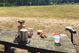 Also im Keller gekramt, einen alten und riesigen Primus-Kocher gefunden, den Rest aus der Küche in den Rücksack gepackt und dann mit dem Rad ab in den Wald, um dort Mittagspause zu machen.