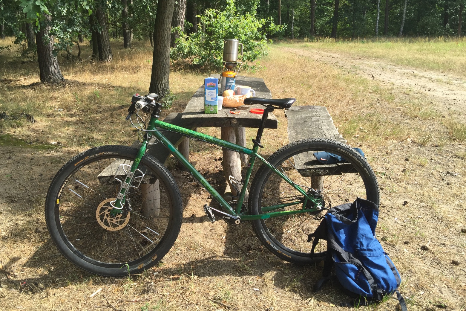 Also im Keller gekramt, einen alten und riesigen Primus-Kocher gefunden, den Rest aus der Küche in den Rücksack gepackt und dann mit dem Rad ab in den Wald, um dort Mittagspause zu machen.