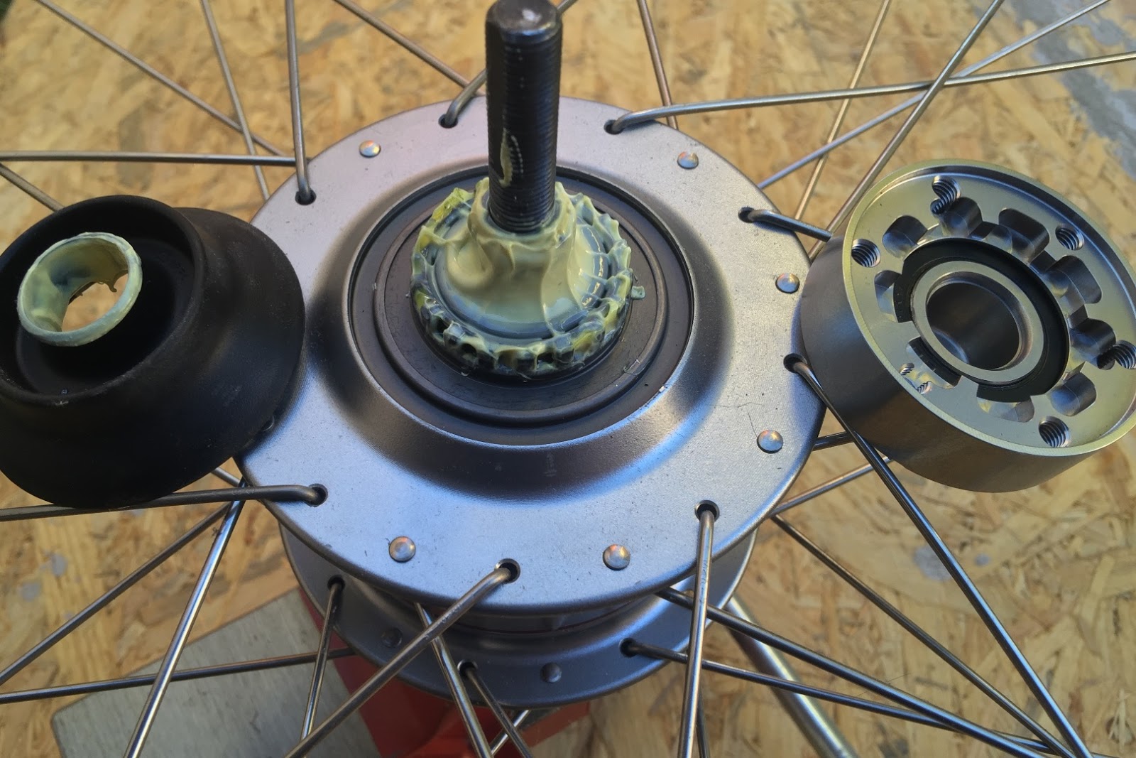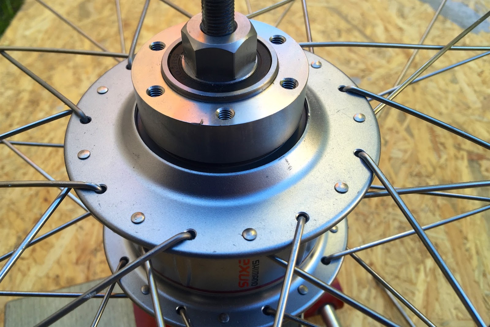Ich hatte noch ein komplettes 26er Hinterrad in einer 8er Nexus-Nabe im Keller, für ein künftiges Projekt war aber eine Scheibenbremsaufnahme notwendig, der Rahmen hat keine Sockel am Rahmen oder an der Gabel für die Aufnahme der Felgenbremsen. Naheliegend wäre der Erwerb eines neuen Laufrades oder nur der Alfine-Nabe (ansonsten ja baugleich…). Durch einen Beitrag im MTB-News-Forum stieß ich auf den Hinweis, das es von CESUR Adapter gibt, mit dem sich Nexus-Naben mit Scheibenbremsen (6-Lochbefestigung) nutzen lassen. Dank 14 Tagen Umtauschrecht kein Risiko, daher habe ich bestellt und heute montiert: Das Suchen des Werkzeuges hat länger gedauert, als der eigentliche Umbau…