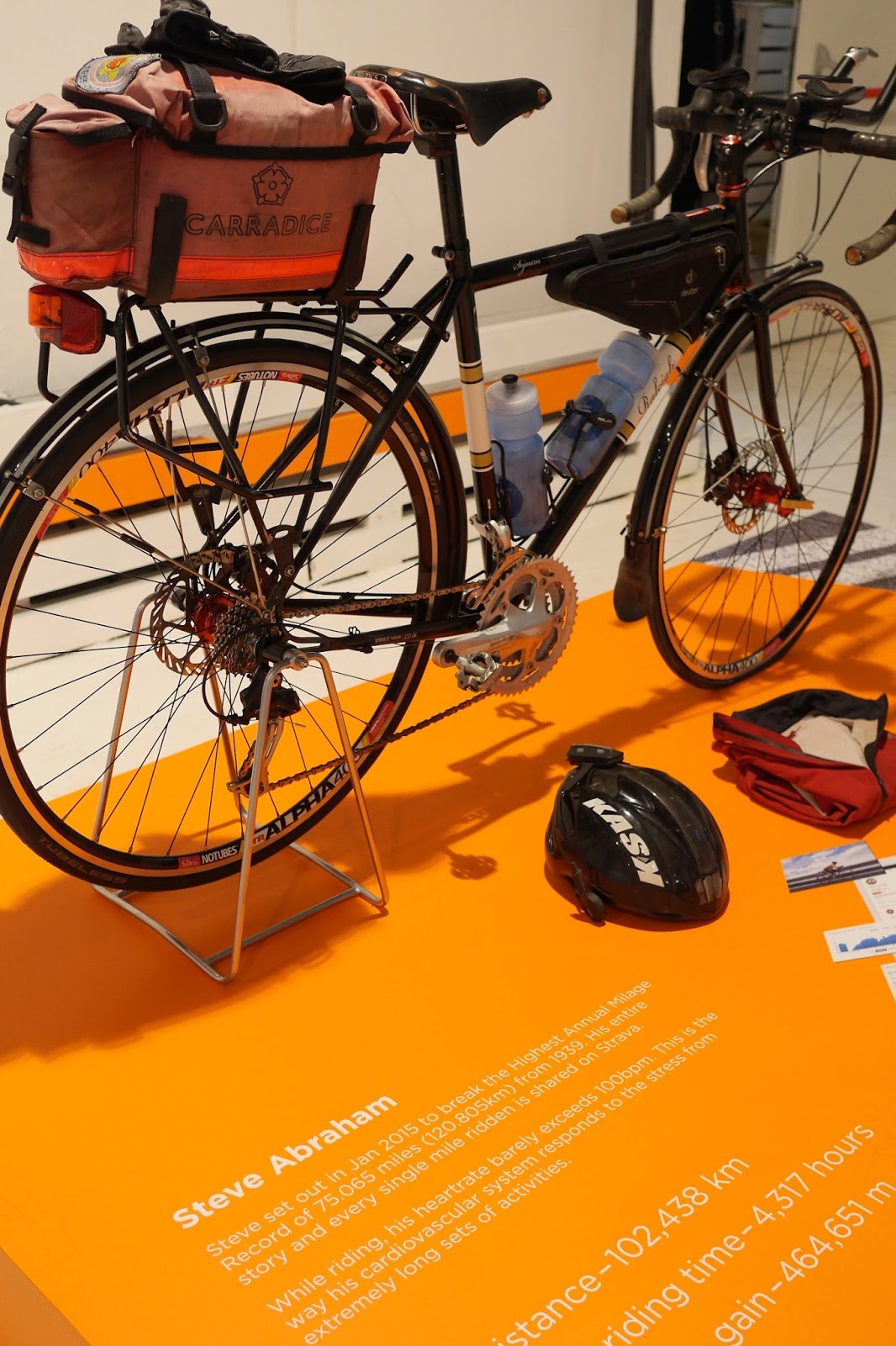 | Das Rekordrad von Steve Abraham, ein umspektakuläres Rad, fast schon lieblos zusammengestellt und doch wurden im Jahr 2015 damit über 100.000 Kilometer absolviert |