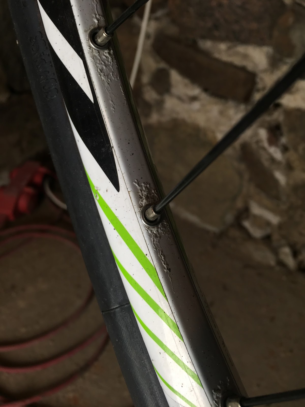 Bei der lackierten Felge zeigen die Wintertouren ihre Wirkung, an allen Speichenlöchern vom Hinterrad blüht die Korrosion. Die Innenseiten der Felgenlöcher sehen noch sauber aus, aber mehr als einen Winter werde ich wohl mit den Felgen nicht mehr fahren können. Die Speichenlöcher sind geöst, das gibt vielleicht zusätzlichen Halt.