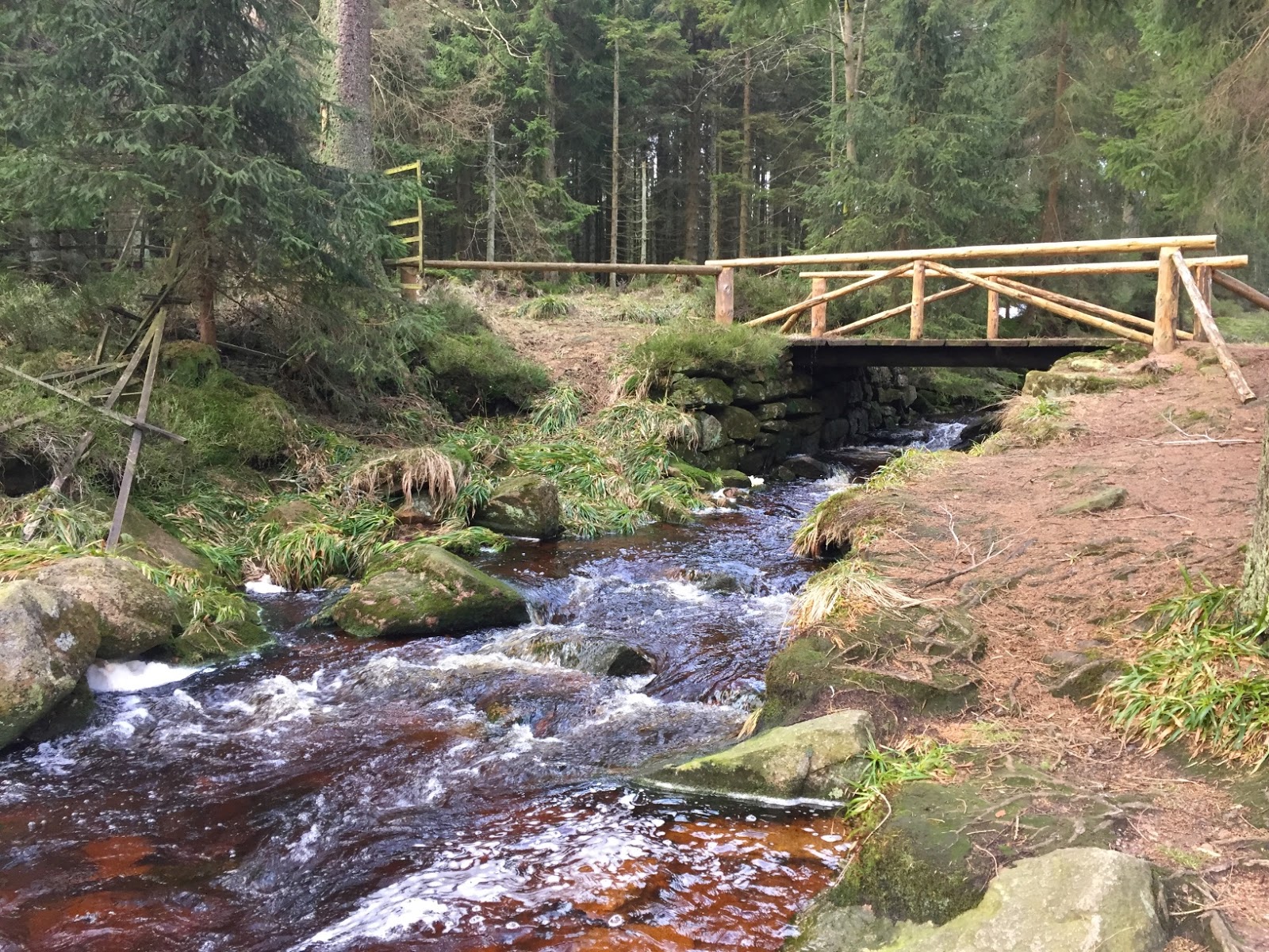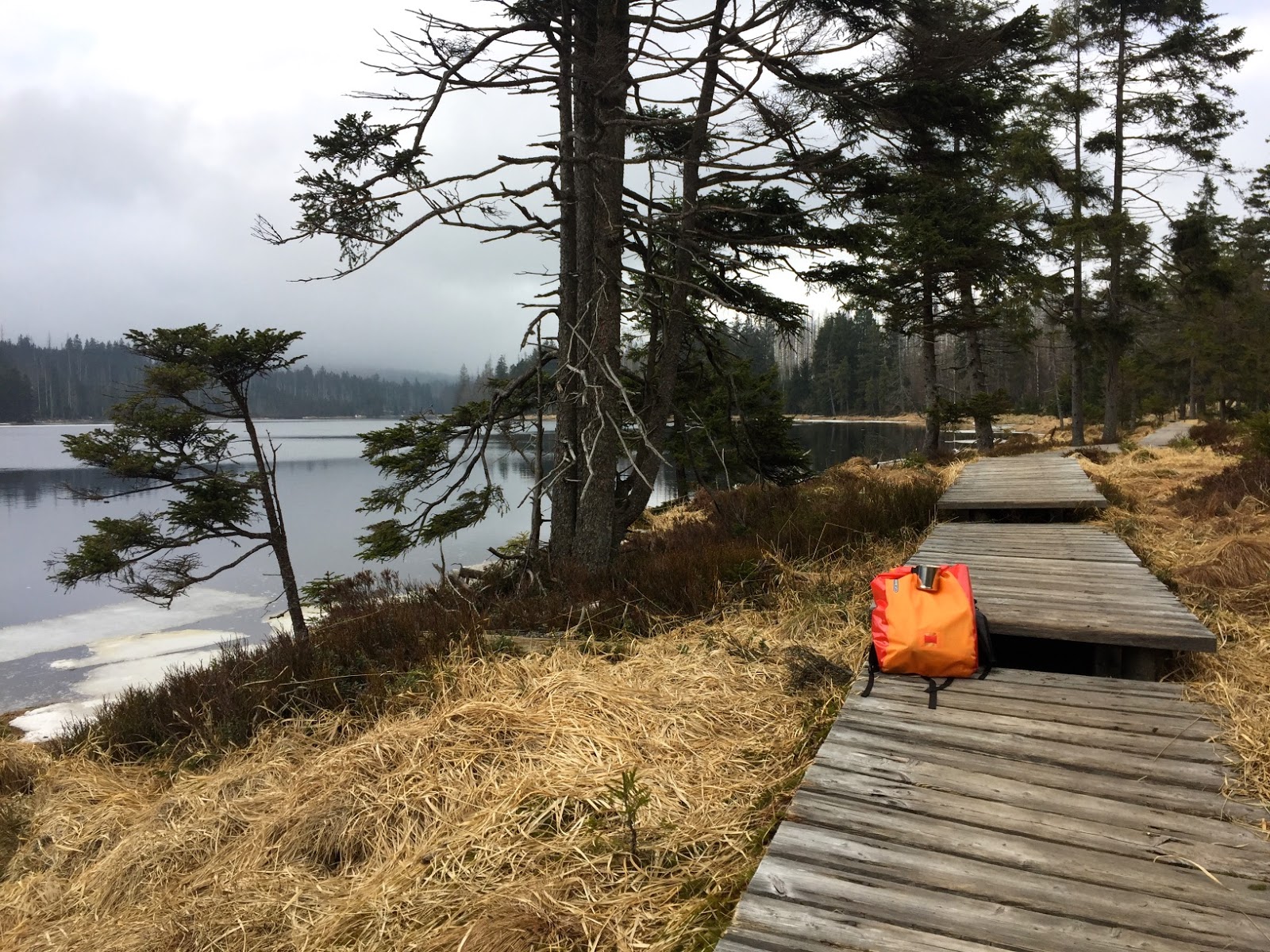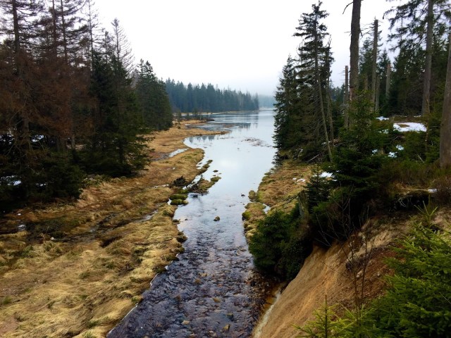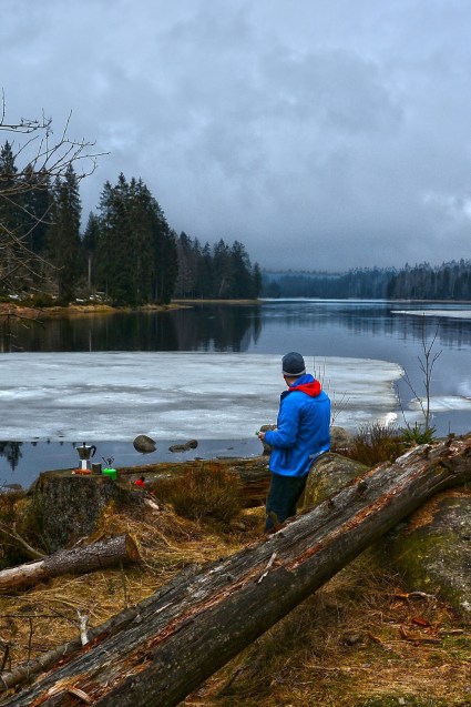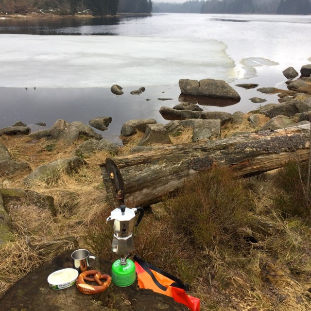 Habe also den Heimweg von Hannover nach Hause über den Harz geführt und am Oderteich eine lange und aktive Pause eingelegt. Erst gab es eine Brezel und Kaffee, dann war ich für einen Fotografen ein willkommener Farbtupfer in der grauen Landschaft und anschließend bin ich um den kleinen Stausee gewandert. Mehr als eine Stunde frische Luft und Landschaft! Herrlich!