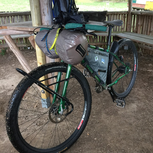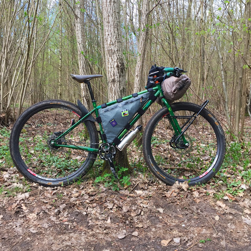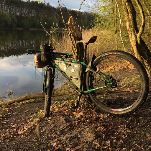 | Setup: wasserdichter Packsack mit Spanngurten am Lenker, Rahmentasche von parsleybags.com |