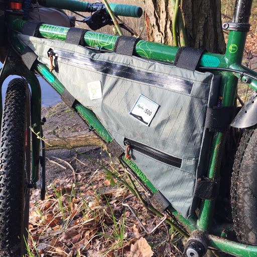 Bewährt hat sich die neue Rahmentasche und ich bin erstaunt, wieviel Ausrüstung/Kram in so eine Rolle am Lenker passt!