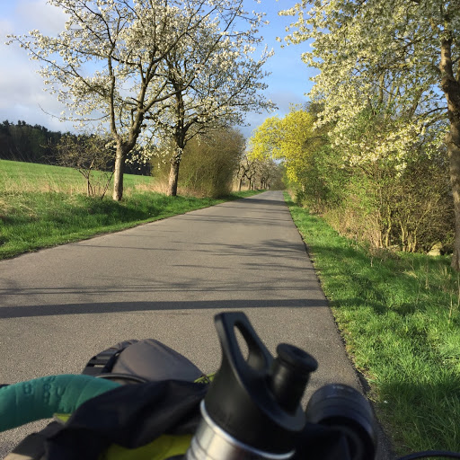 Irgendwo bei Spitzmühle merke ich, daß der Garmin nicht mitloggt, sondern irgendeine Eingabe erwartet. Bis dahin bin ich wohl schon etwas über 10 Kilometer geradelt. Die Geschwindigkeit ist spürbar niedriger, einerseits durch das Gepäck und andererseits gebe ich auch nicht so viel „Gas“, sondern genieße das ruhige Kurbeln durch die Landschaft.