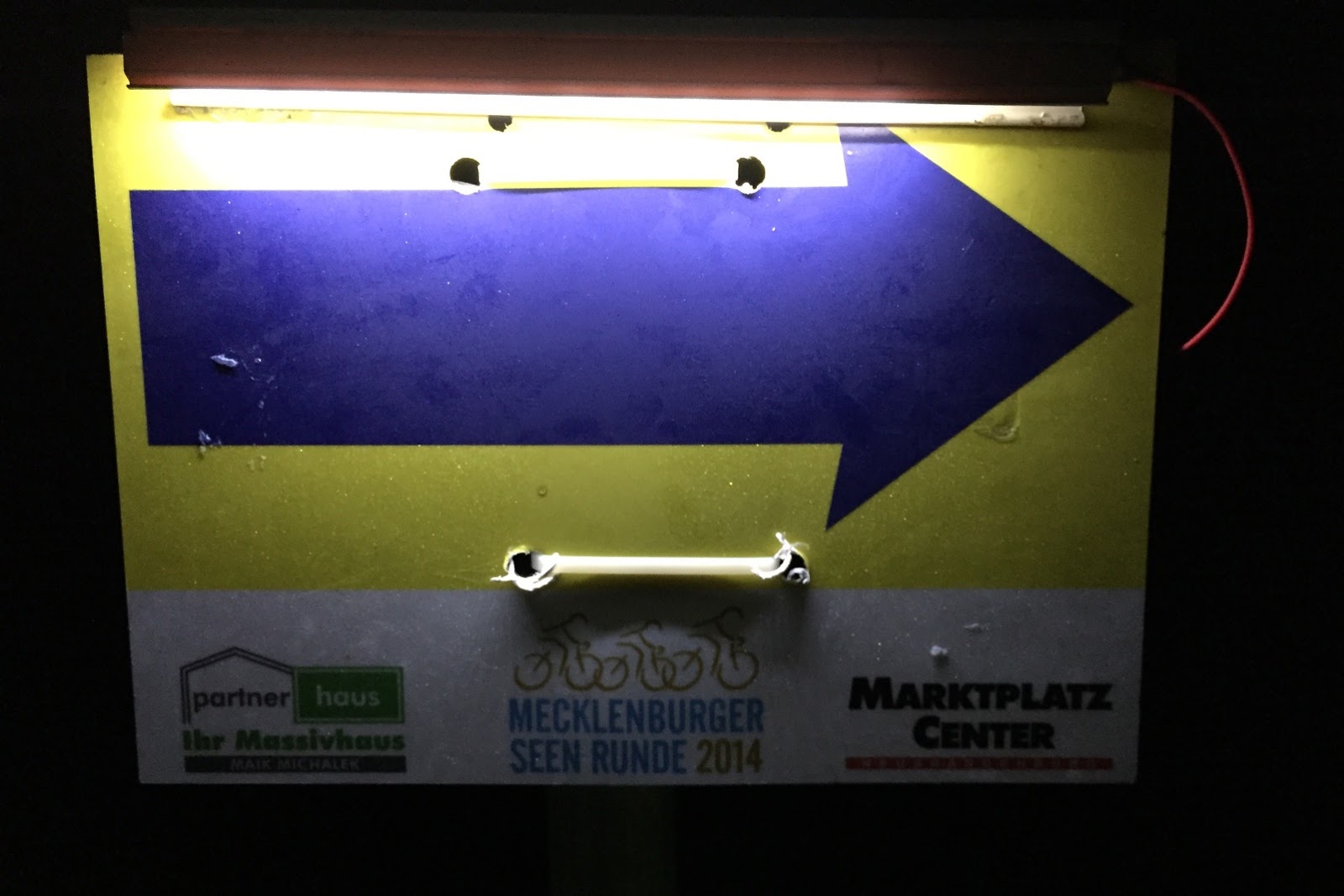 In Neustrelitz biege ich ins Depot ab, es gibt leckere Bananenstullen und wieder zwei volle Flaschen Wasser. Danach finde ich eine große Gruppe, gefühlt um die 100 Fahrer. Sehr viel Unruhe im Feld, ständig Postionswechsel, unklare Handzeichen, regelmässige „Wo-ist-Frank?-Rufe“ (hat Frank die Kekse für den Rest vom Team?) und viele dieser blinkenden Rücklichter. Das raubt viel Konzentration, nutze die volle Blase, um mal auszuscheren und das Feld ziehen zu lassen. Dann wird auch der Kontrast deutlich, ich kann als Alleinfahrer die Nacht intensiv wahrnehmen: deutlich kühler, hier und da Froschquacken, die verschiedenen Vögel zwitschern, die Grillen sind zu hören. Natürlich auch ein, zwei Gänge langsamer.
