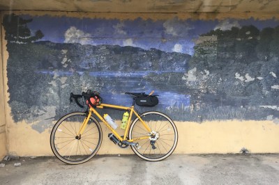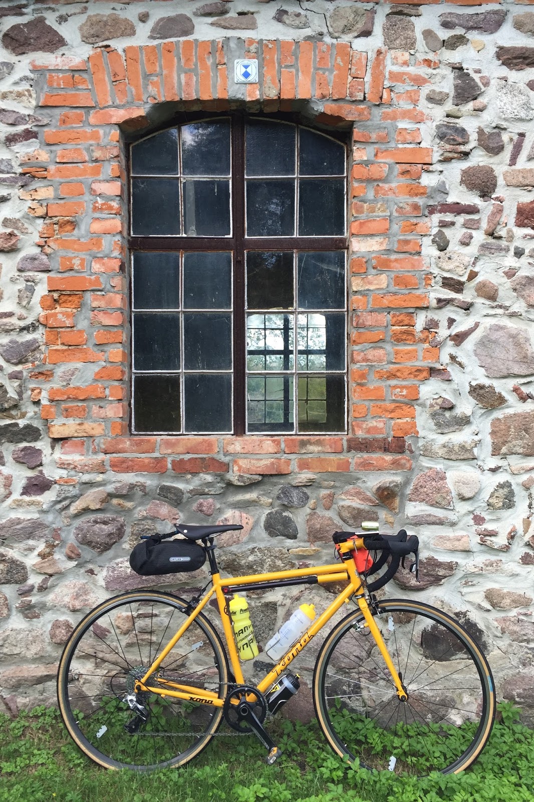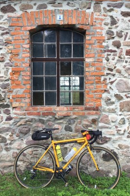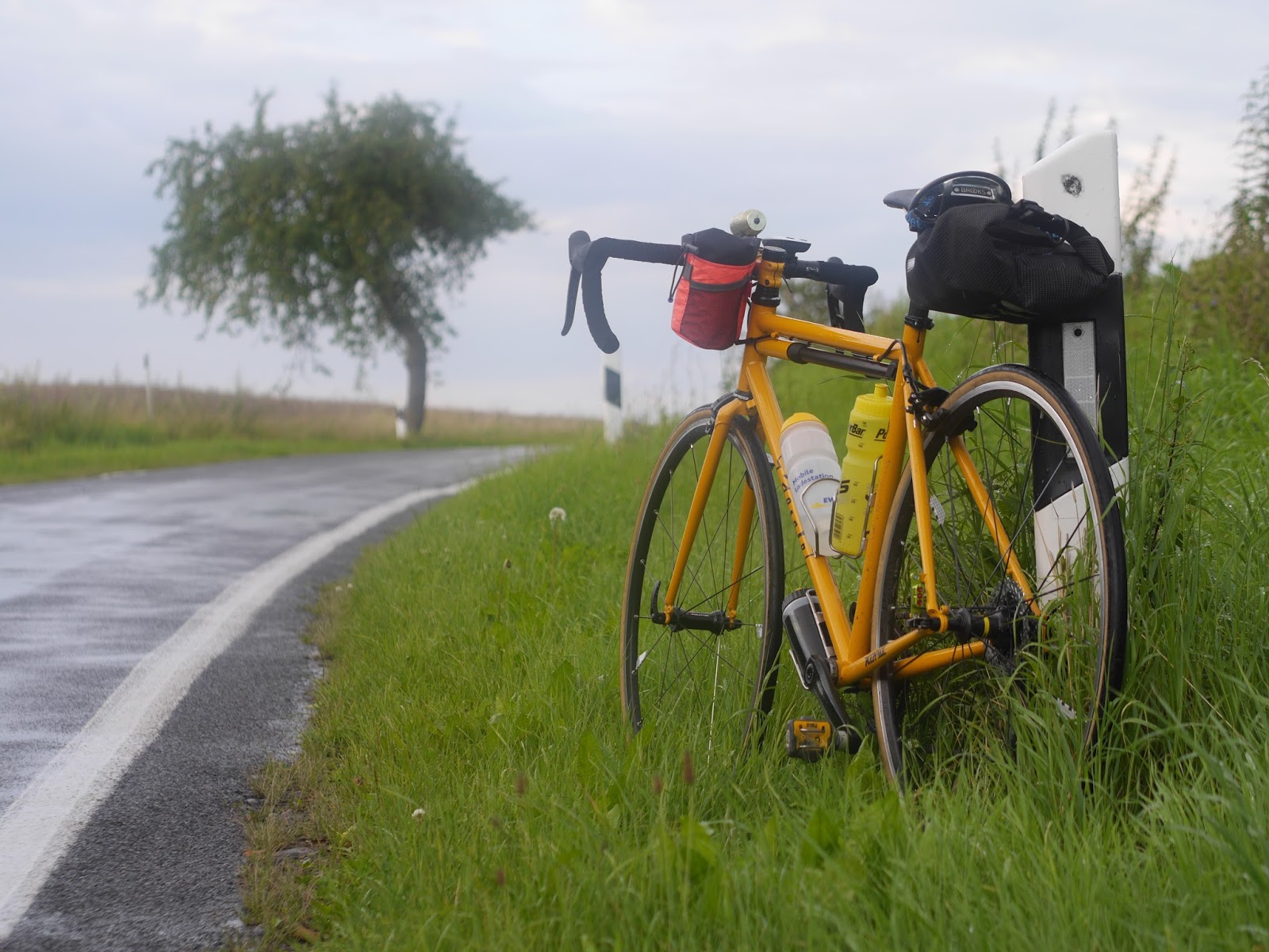 | Landstraßenimpressionen, die Ortliebtasche unterm Sattel trägt die Kamera und lange Sachen |