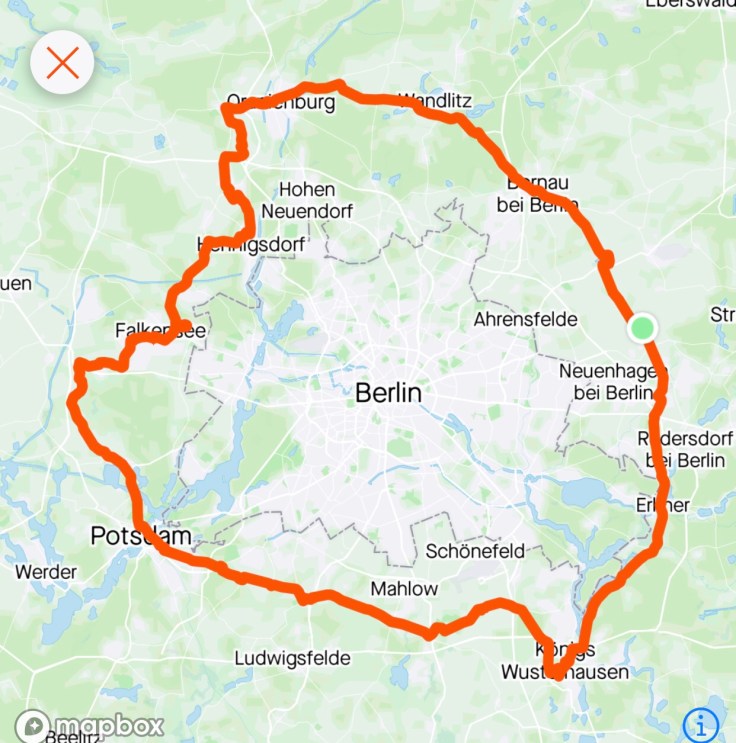 Das mit dem DIY-Brevets war mir noch einen weiteren Versuch wert. Himmelfahrt 2020, die Mädels pennen noch, ich rolle von Altlandsberg Richtung Süden. Brauche wieder ein paar Kilometer und Pinkelpausen, um in einen Rhythmus zu kommen. Ab Erkner rollt es. Durch den Feiertag sind um diese Tageszeit die Straßen noch sehr leer, ab und an sind andere Frühsportler zu sehen. Man grüßt sich und genießt den Sonnentag. Der Plan ist heute eine Umrundung von Berlin, die Route habe ich mir mit Komoot zusammengestellt. Und durch die Gegend ist die Strecke auch relativ „langweilig“ bzw. vorhersehbar, es gibt halt die typische Landschaftseinrichtung vom Berliner Speckgürtel: Dörfer mit Kirche im Kern, manchmal nen Gutshaus, Einfamilien-Neubauten in den neuen Wohngebieten. Hier und da ein Gewerbepark und viele Pferdehöfe. Dazwischen die Brandenburger Alleen bzw. die Reste davon, alternativ Umgehungsstraßen mit breiten Radwegen. Aber es rollt sehr gut, Potsdam ist dann überraschend schnell erreicht.
