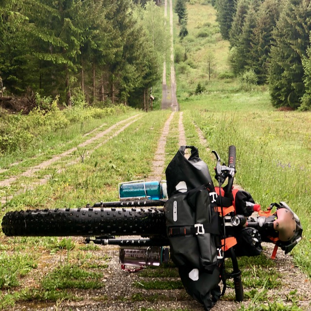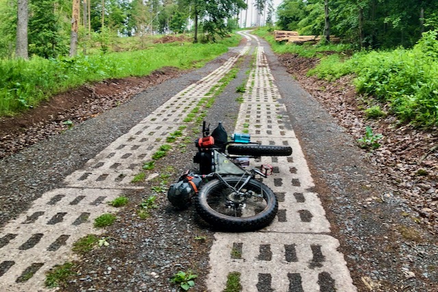 Nach der absolvierten Tour kann ich Emma Thomson und Gunnar Fehlau nur Recht geben: 29×3 Zoll ist das perfekte Format. Ggf. geht auch 27,5×3 Zoll, aber schmalere Reifen machen das Vorhaben sehr schwer. Die „fallen“ in die Löcher der Platte, Abfahrten gleichen einem Ritt auf nem Presslufthammer, das war beim Fahren hinter einem Teilnehmer mit nem klassischem 26er aus dem Jahr 2013 deutlich zu sehen. Die breiten Reifen geben bei den Abfahren viel mehr Sicherheit, letztendlich ist daran auch schön die Entwicklung der Radtechnik erkennbar… Ich zolle meinen Respekt den Leuten, die das Ding damals oder auch jetzt mit 26er MTBs absolvieren, ich möchte das auf keinen Fall versuchen…..