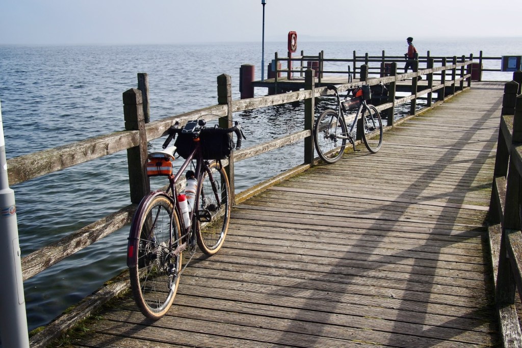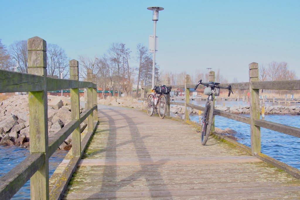 Zur Tour: Hendrik und ich haben uns für ne 100er Runde verabredet, um Uhrzeigersinn um die Müritz. Die Gravelreifen bewähren sich auf den verschiedenen Untergründen: Asphalt und Pflasterstraßen in den Touristenhochburgen, Schotter und schlechte Feldwege auf der Ostseite der Müritz. Rechlin bleibt mir in Erinnerung, weil ich das mehr als 20 Jahre nicht wahr. Vormals ein Ort mit zwei Teilen: dem eigentlichen Dorf und der Konversionsfläche der Militärs in der ehemaligen DDR. Bei meinem letzten Besuch bin ich durch die verlassenen Gebäude der Garnison und des Werftbetriebes gestromert, da waren an den ehemaligen Bürotüren noch die Schilder der FDJ-Betriebsorganisation. Inzwischen ist die Konversionsfläche komplett verwandelt, eine riesige Ferienhaussammlung in Verbindung mit einem Yachthafen für die Charterschiffe auf der Müritz. Zum Zeitpunkt unserer Tour lagen die Schiffe auf riesigen Freiflächen im „Winterlager“, sah etwas unwirklich aus.