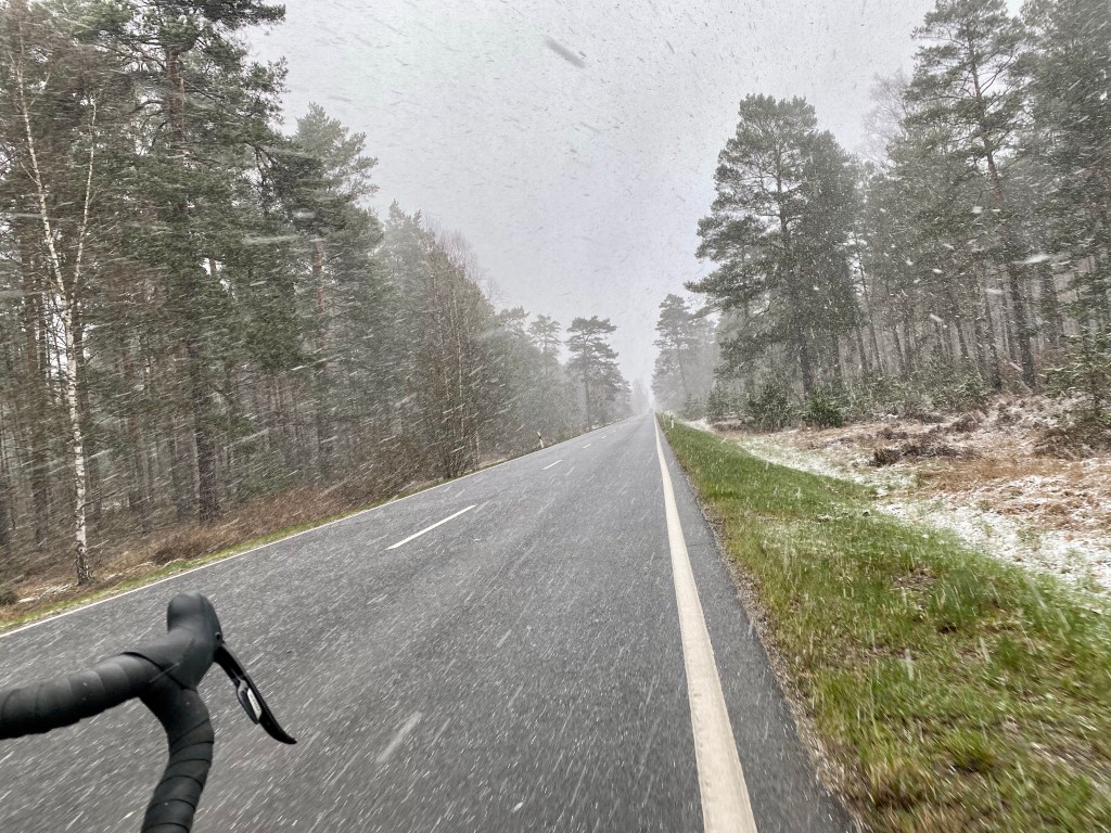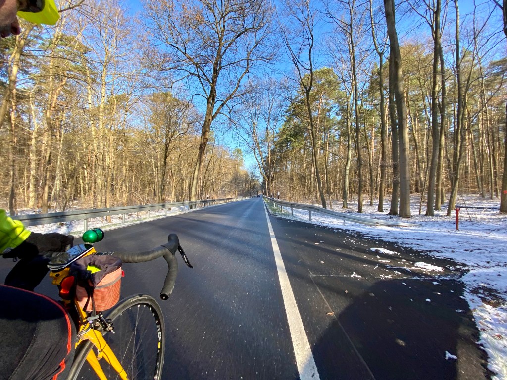 Es geht kurz nach 08:00 Uhr los, lt. Wettervorhersage soll es ein schöner Tag werden, kein Niederschlag, ein wenig Sonne und Temperaturen um die 6 Grad Celsius. Blöd nur, dass es Nachtfröste gab und es ein wenig geschneit hat. Naja, es rollt trotzdem gut, mir machen erstmal die Reste meiner Erkältung zu schaffen. Der Puls ist spürbar höher, Leistung aufs Pedal ist nicht in gewohnter Weise abrufbar. Nehme das Tempo raus, will das Ding nicht gleich am Start verhauen….