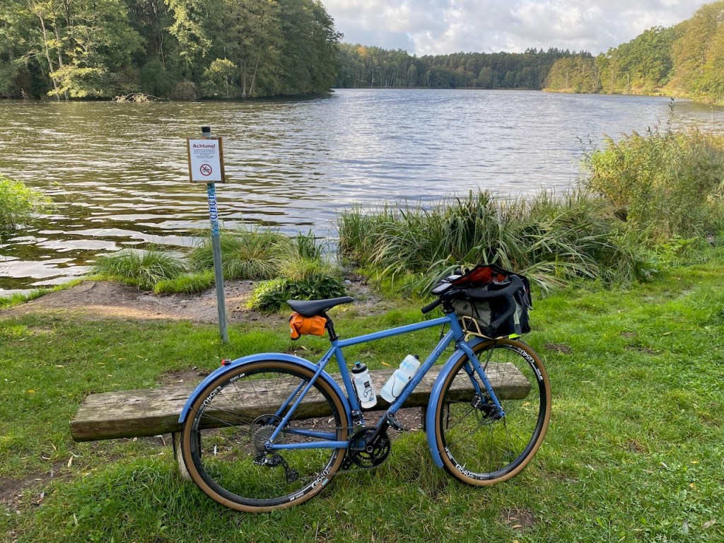 Die beiden Randonneure treffe ich mehrfach entlang der Havel südlich von Zehdenick. Zunächst finde ich den Anblick in der Herbstsonne cool, dann finde ich auch Gelegenheit, mir deren Räder anzuschauen. Ein Rad total modern und mit den schönsten Teilen aufgebaut, das andere Rad scheint ein gut genutztes Reiserad aus den 90ern zu sein, noch mit Magura HS66-Bremsen. Zwei Sachen eint die beiden: sie haben das gleiche Reifenformat und sie sind irgendwann schneller als ich. 😉