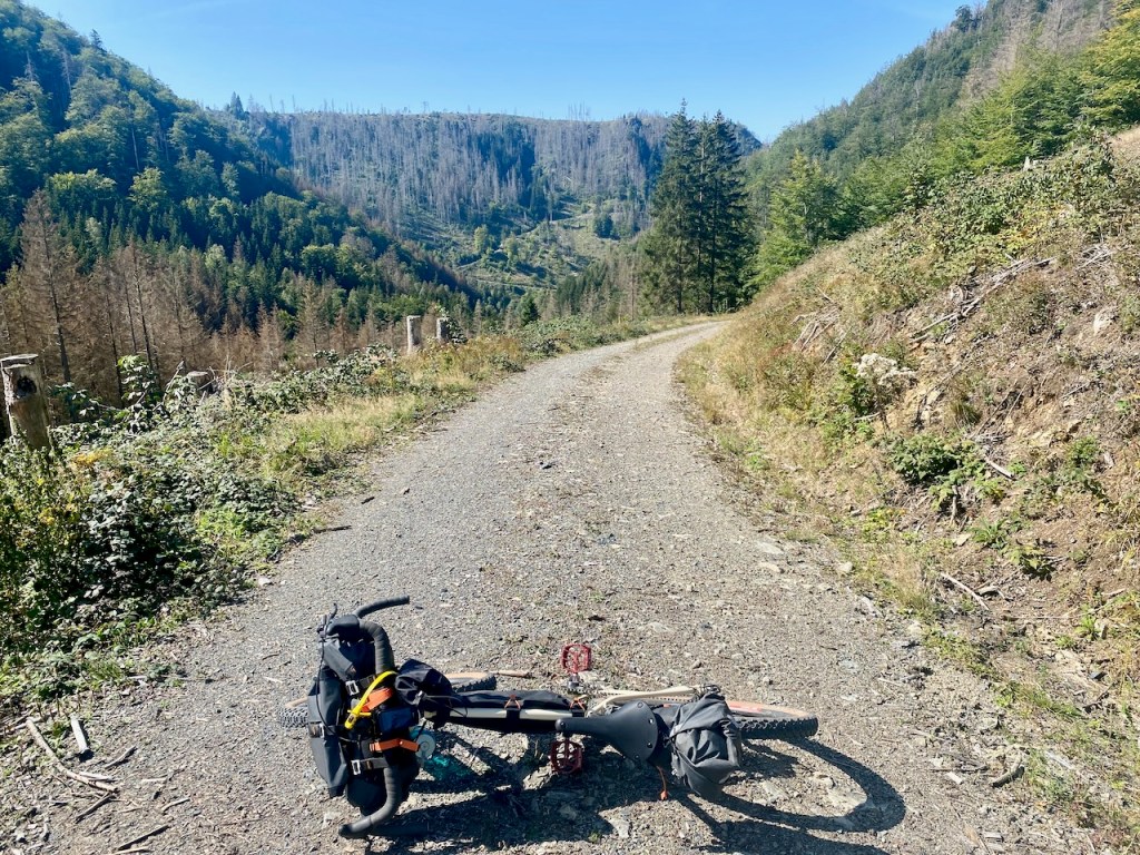 Die Landschaft entschädigt, auch wenn der Borkenkäfer den Harz arg zugesetzt hat und immer noch aktiv ist. Zum Glück sehe ich keine Hangabrutsche, anscheinend halten die alten Fichtenwurzeln und der „Pionierbewuchs“ die Hänge auch bei Regenfällen fest…